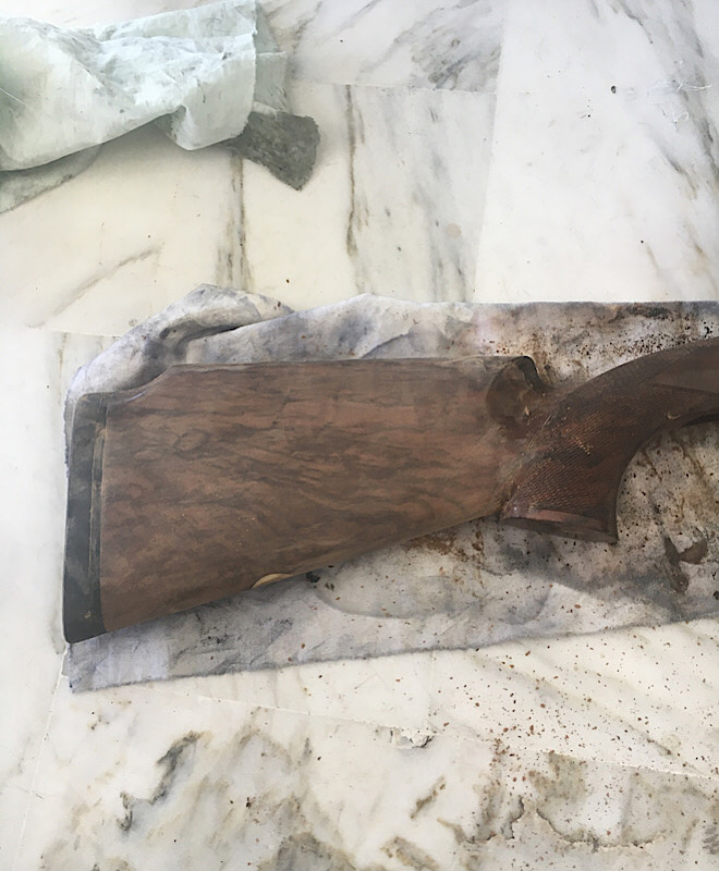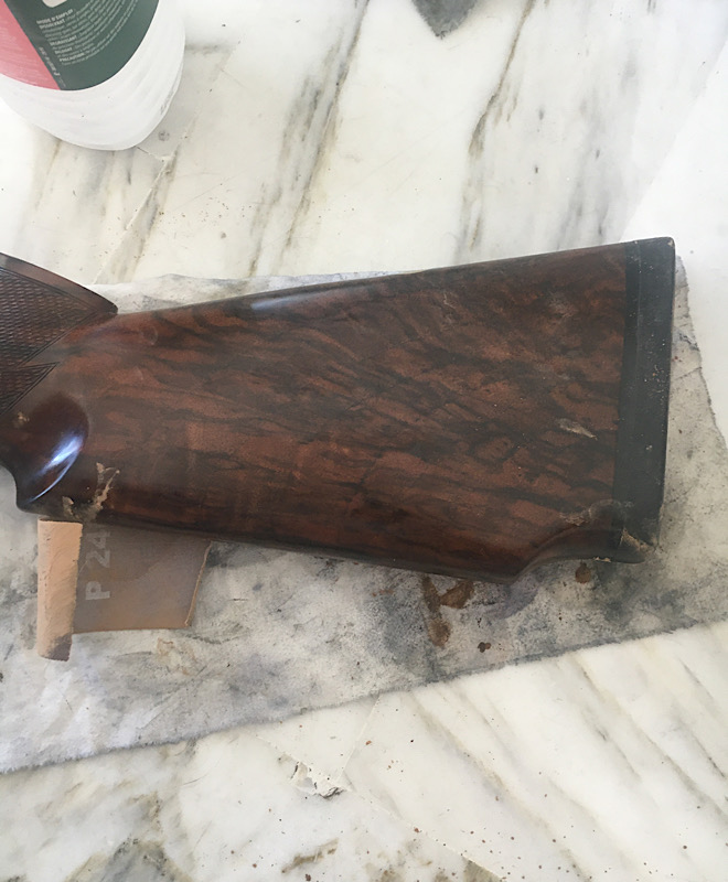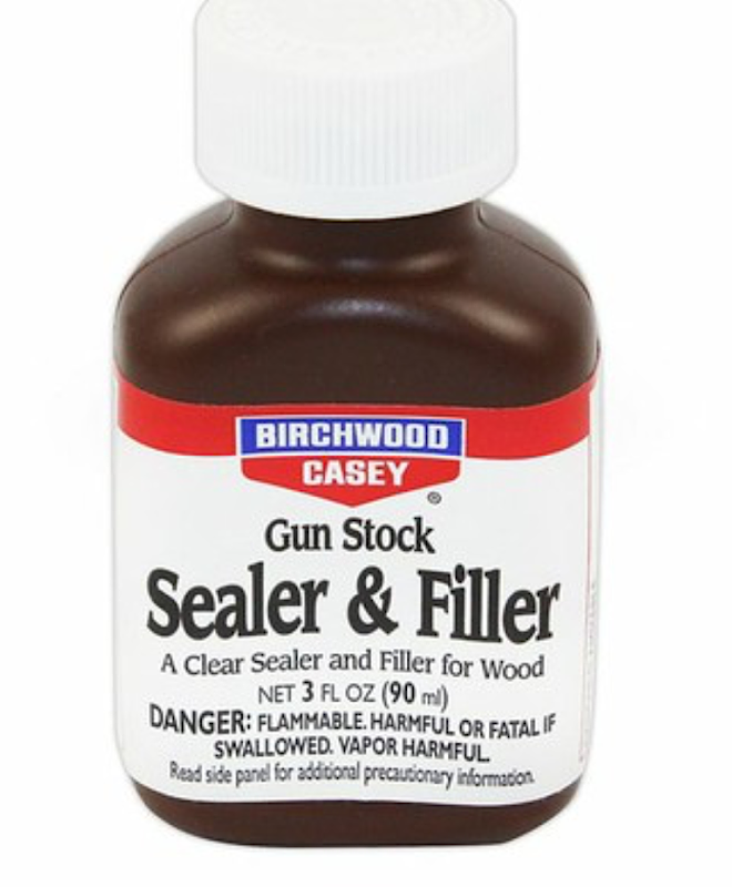 Phase 2 , le boche porage .... petite precision, comme la crosse est en noyer turc et qu’elle a une vilaine tendance à noircir avec l’huile de lin ..... j’ai décidé de fixer la couleur avec un bouche pore tres performant. Le Sealer -Filler de birchwood .... première couche presque sèche mais pores encore ouvert donc ..... je vais continuer.... voila les photos .....