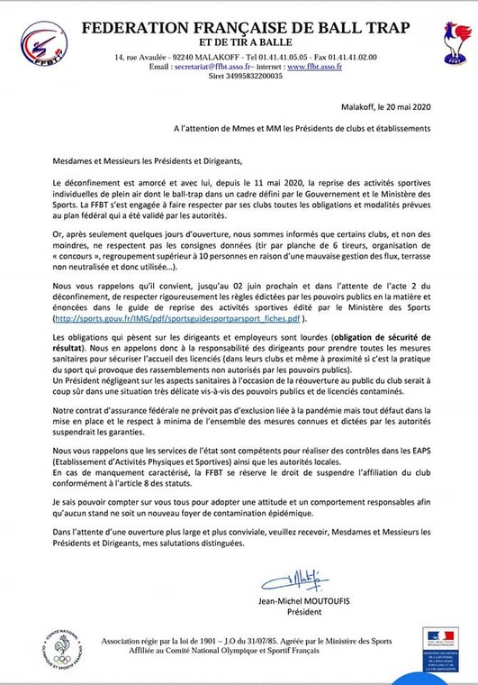 La FFTir a obtenu pour ses clubs l'autorisation de pouvoir ouvrir de nouveau leurs portes à partir du 18 mai 2020, dans le strict respect des normes sanitaires édictées par le Ministère des Sports et sous condition d'accord municipal pour les clubs de tir municipaux.